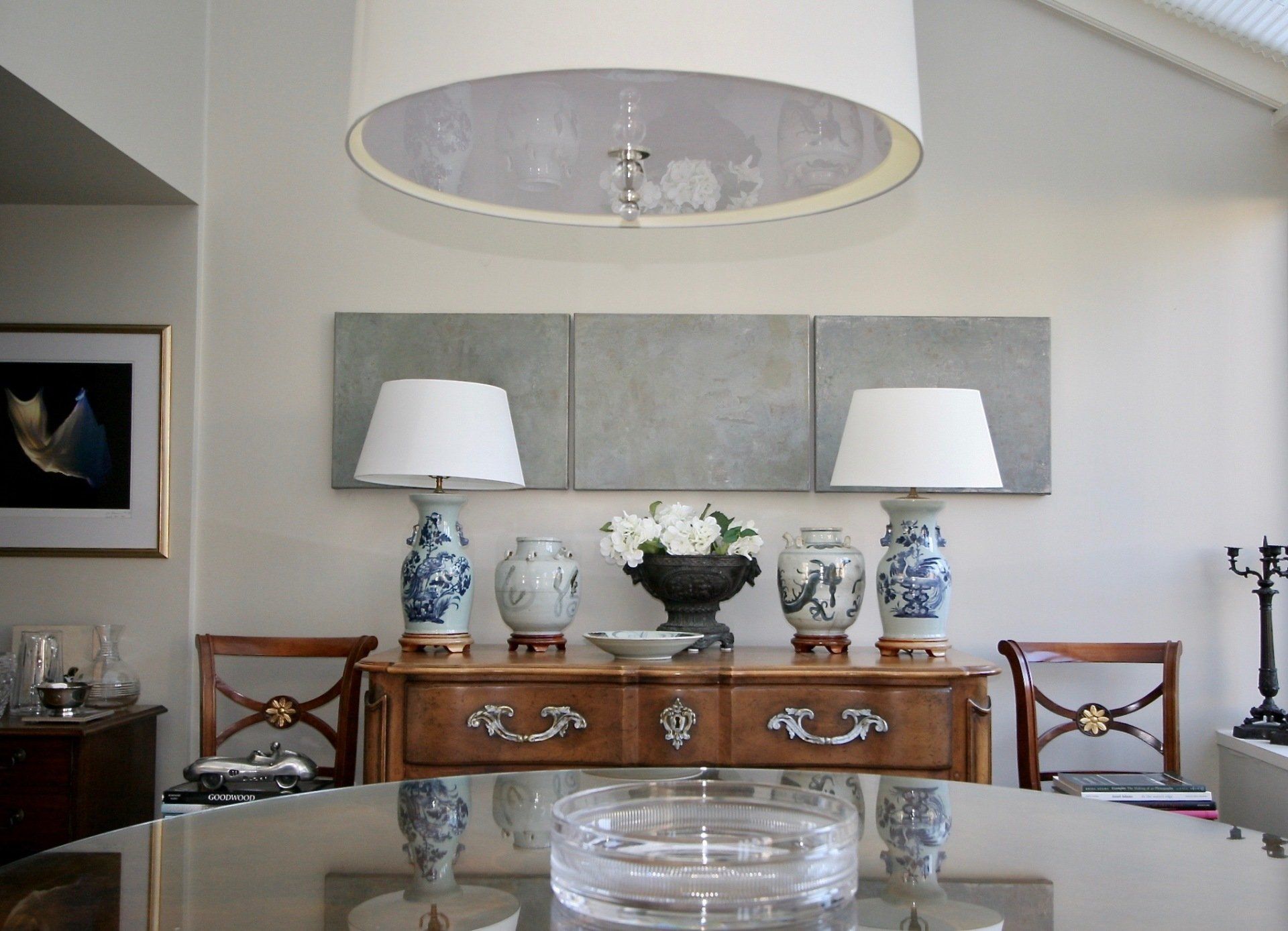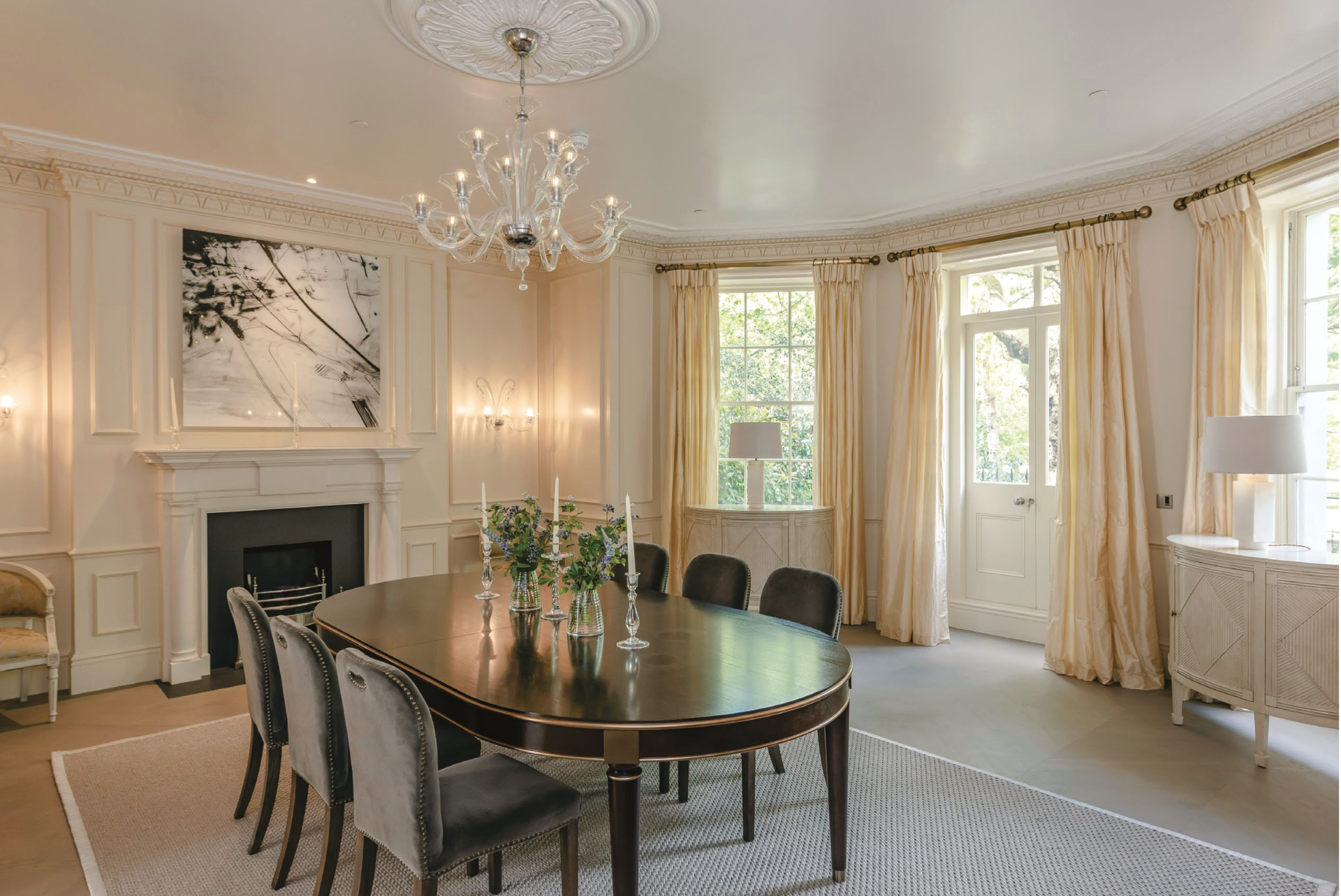 Two abstract works and a photograph by Andrew Holigan over the mantle along with "Cristabel" centerpieces and crystal candlesticks by William Yeoward served as the decorative elements to the custom-designed dining table, sideboard, and window cabinets by Decca London. The curtains are in a Romo fabric.