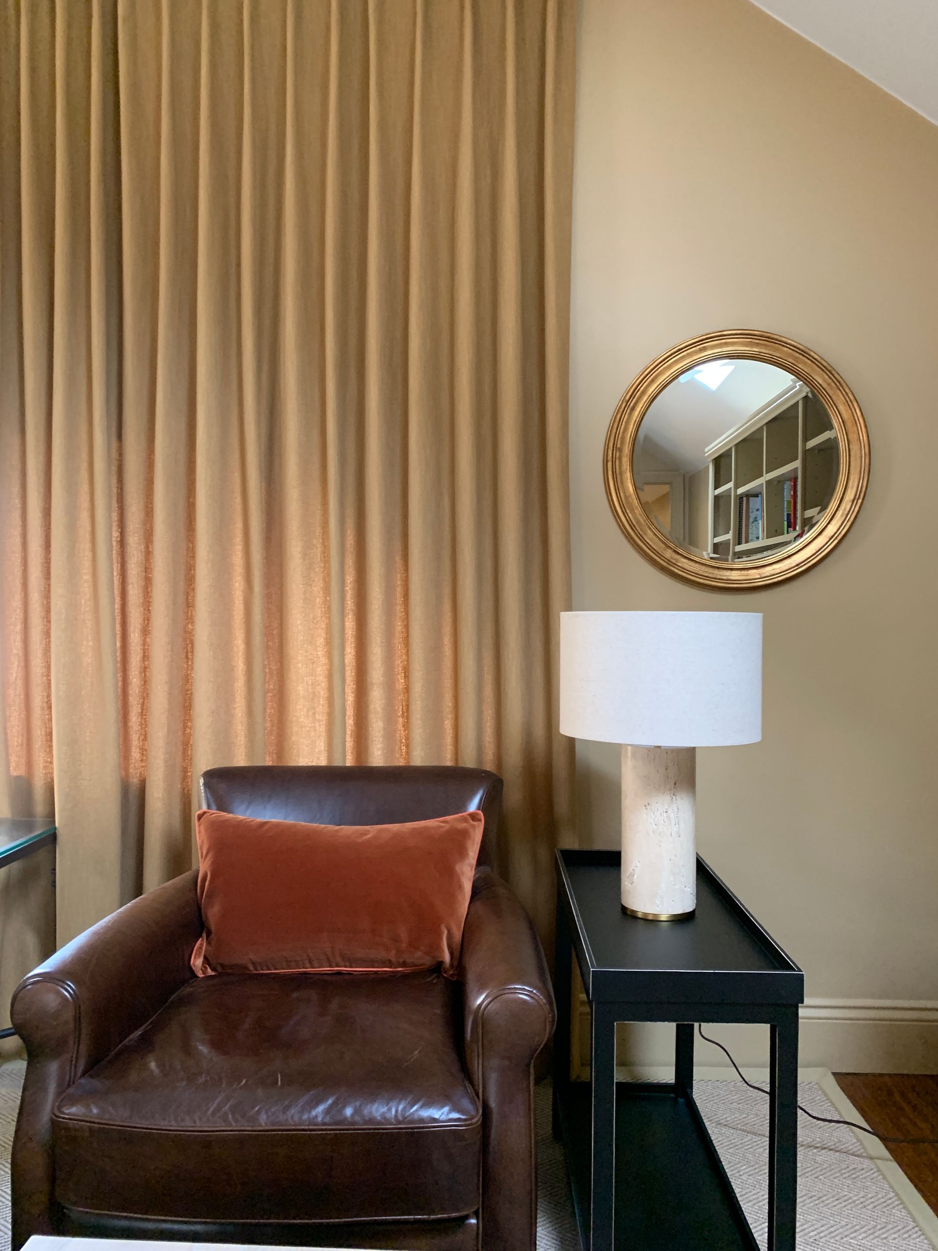 the addition of a new sofa, desk lighting, window treatments, and pillows transformed this workspace.