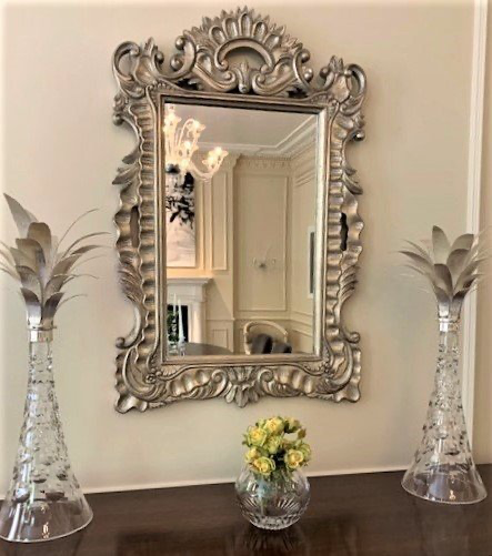 Baker's "Paris floor lamp", Decca London's Demi Wing chairs, and William Yeoward's "Eugenie" covered crystal centerpiece and a photographic print by an LA-based cinematic photographer complements the setting.