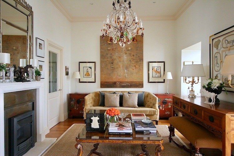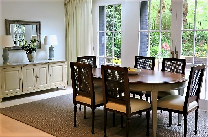 The brief was to design the living, dining/garden rooms interiors retaining the integrity of the historic details. A fireplace was installed which served as a focal point along with a much-needed heating element since three radiators in the living room were removed so as to free up the wall space allowing furnishings to be placed in front of them. A bookcase was custom designed to house books, audio and video elements, hidden in drawers, as well as a screen.