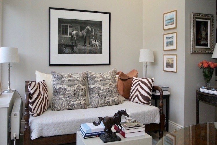 The subtle blues and beiges, along with touches of cobalt blue, black, and gold, were influenced by the focal artwork in the drawing-room. The gray walls were repainted in off-white to brighten the rooms and create an envelope for this subtle palette.