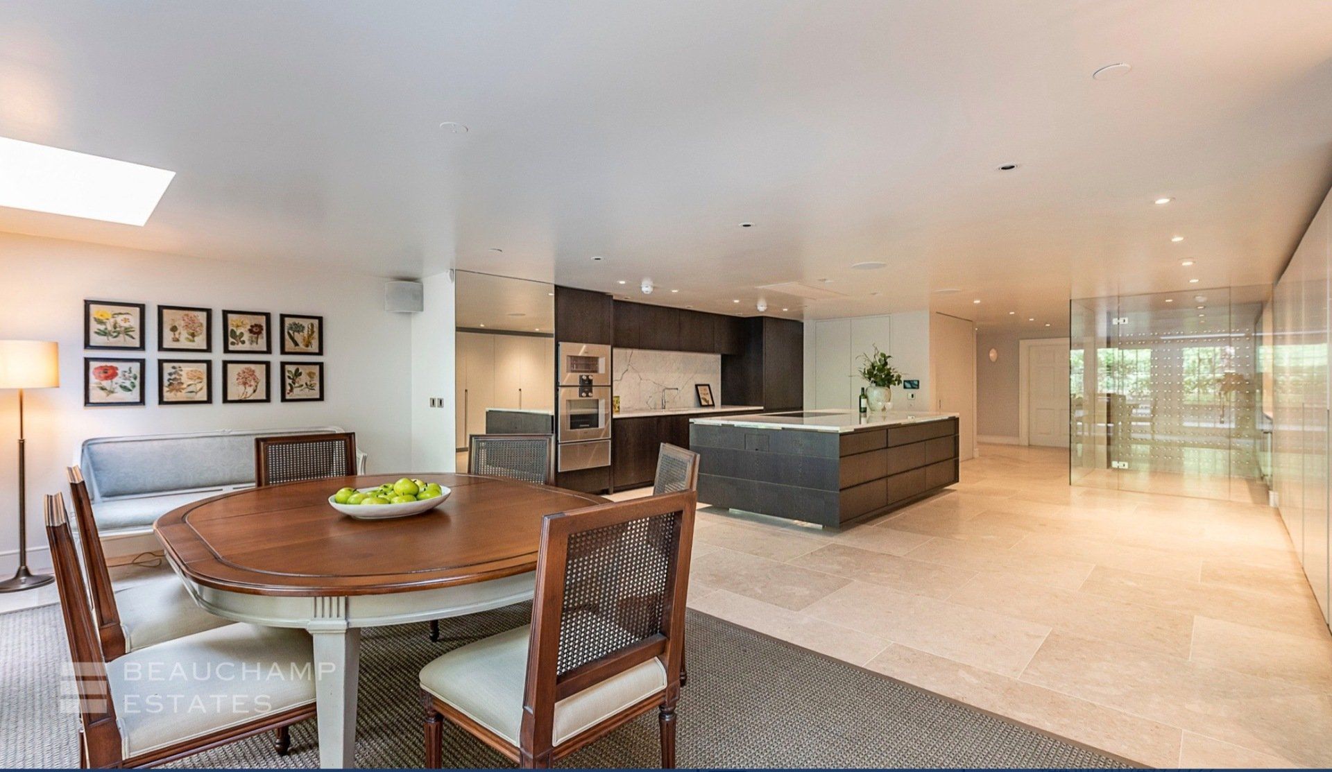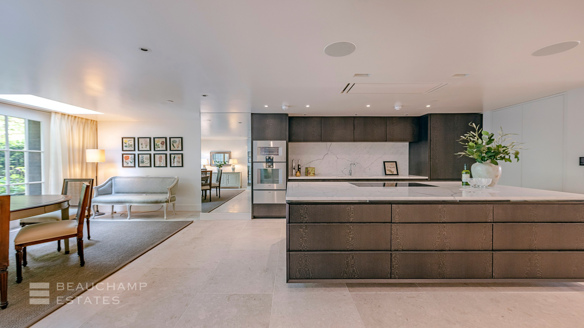 A beautifully relandscaped garden by Abel Gardeners looking onto St. James Park is the view from the kitchen which includes custom furniture by Officina Inglesa, insulated curtain fabric by Creation Bauman, and bespoke lamps by Rosanna Lonsdale